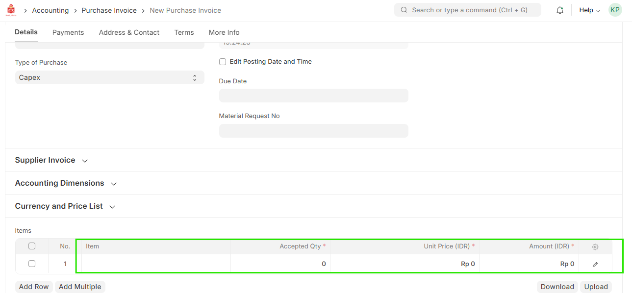 - In 'Supplier Invoice' section, enter 'Supplier Invoice No.' & 'Supplier Invoice Date'