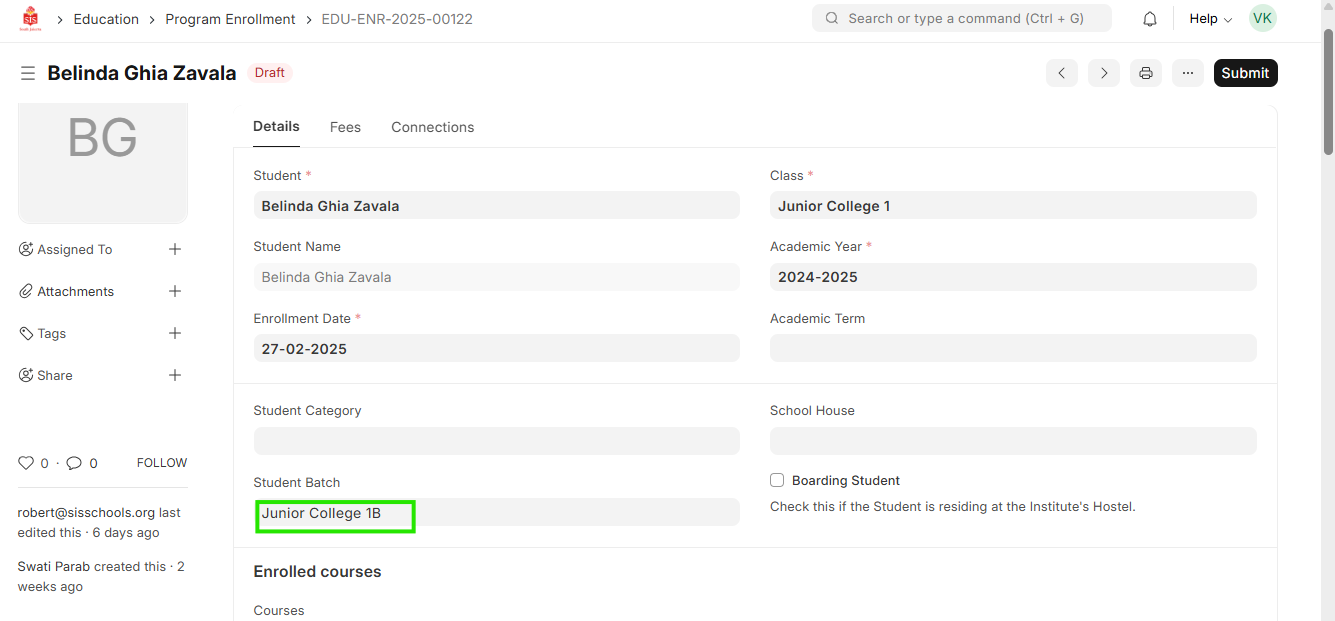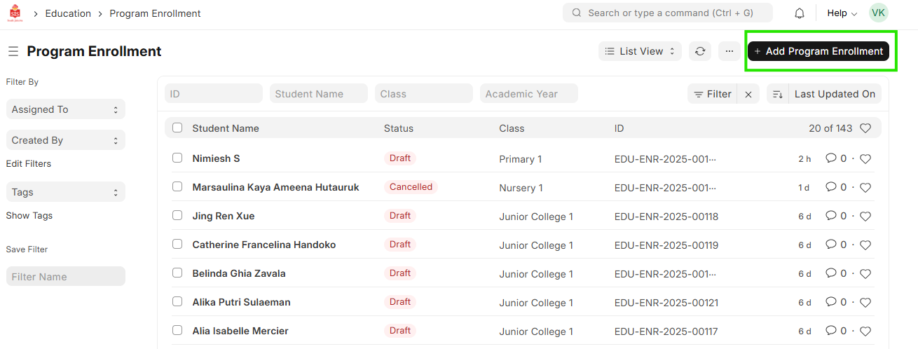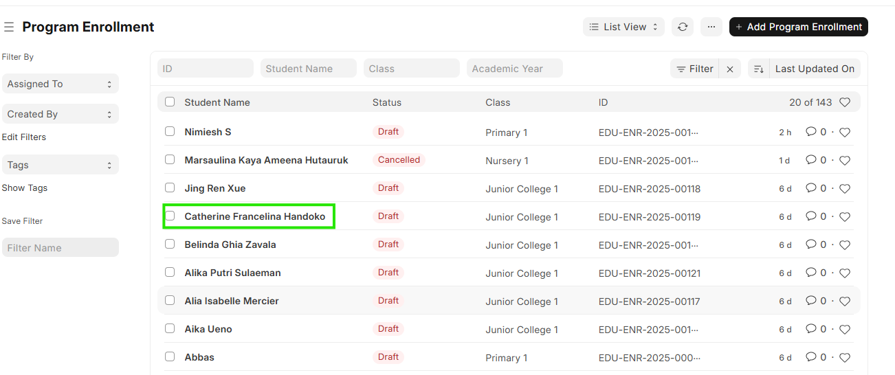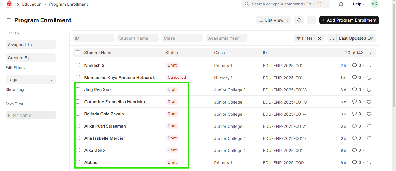 2. Check the the list of students under the status of "Draft". These are students who have not been enrolled