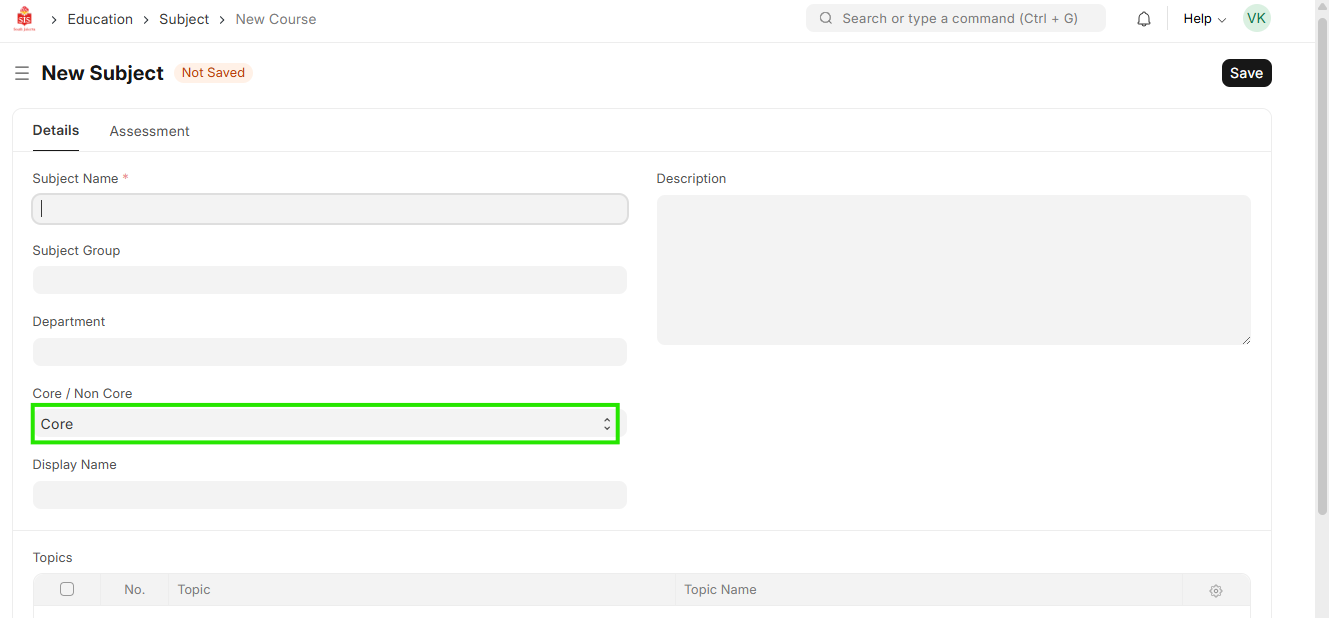 3. Select if the subject is core or non core