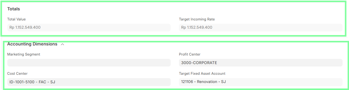 The Total Value and Target Incoming Rate will be auto-calculated based on the fetched assets.