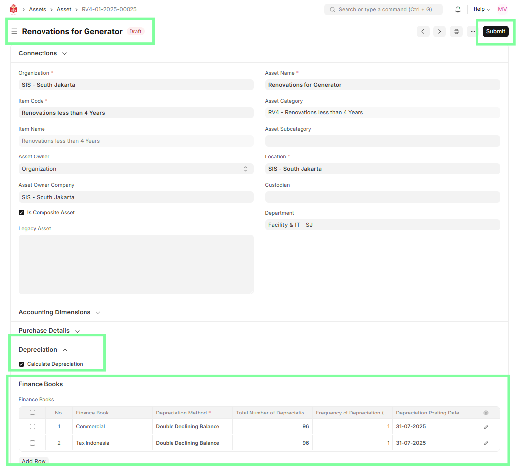 After submitting the Asset Capitalization, go back to the composite asset created earlier, set the depreciation details (if any), and then submit the asset.
