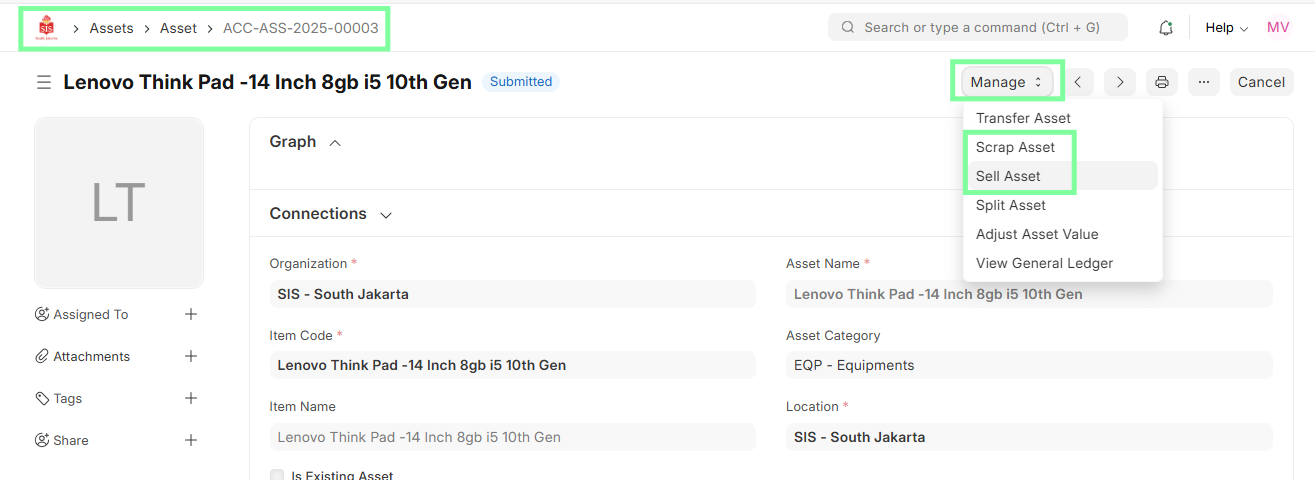 Click on Manage button to select the activity - Scrap Asset OR Sell Asset.