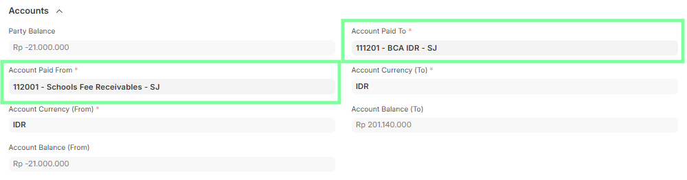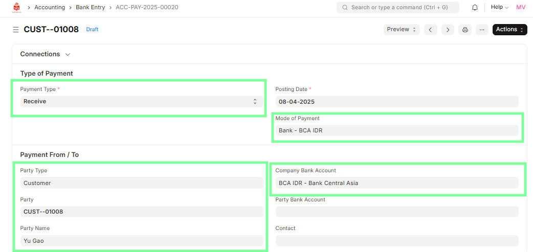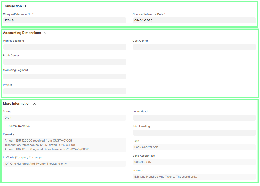 - Reference Details (e.g., Sales Invoice, Bank Account, Amount, Date)