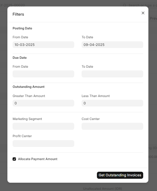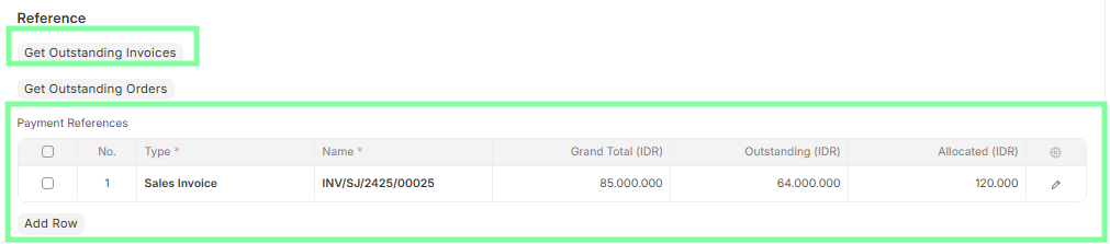 - Use the Get Outstanding Invoices button to auto-fetch linked Sales Invoices.
