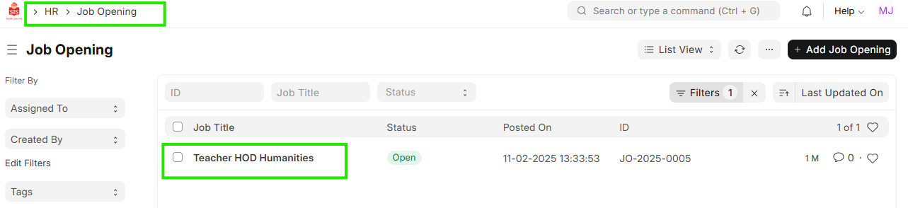 Navigation: Home > Select HR Module > Select Recruitment > Job Opening OR Navigation: Home > Select HR Module > Select Recruitment > Job Applicant"