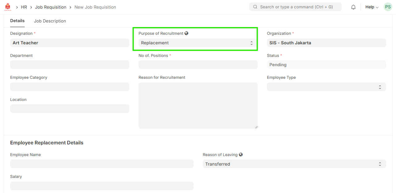 2.2 If Purpose of recruitment is Replacement then Employee replacement details need to be entered.