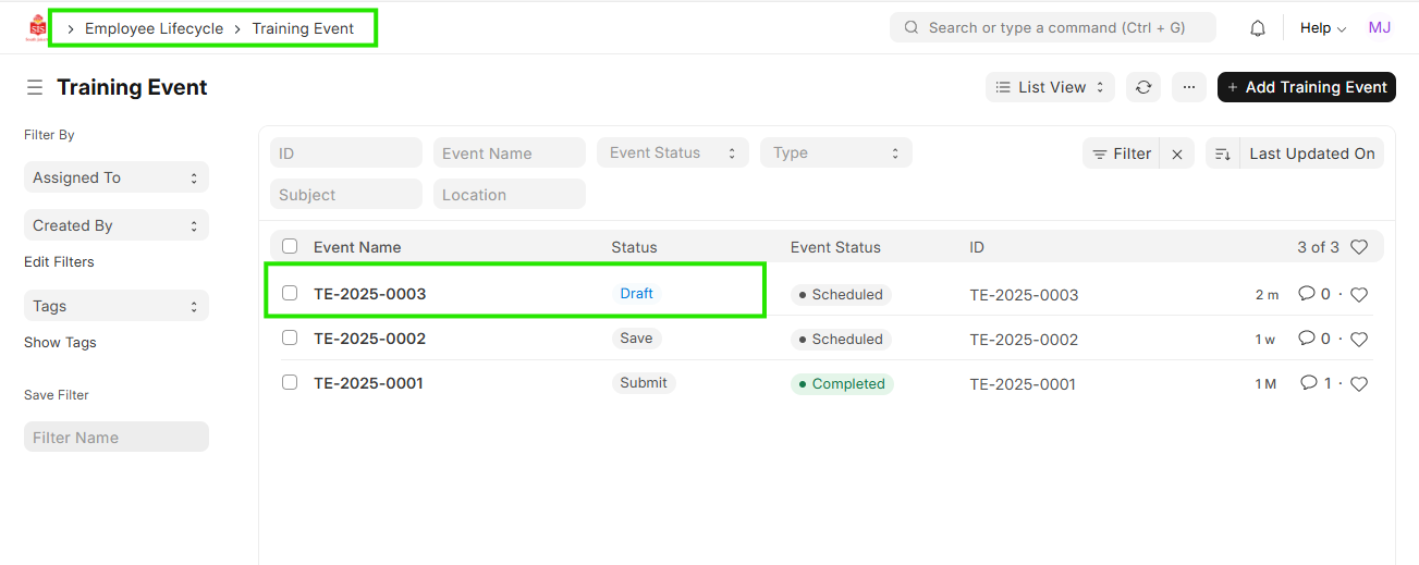 Navigation: Home > Select HR Module > Select Employee Lifecycle > Training Event