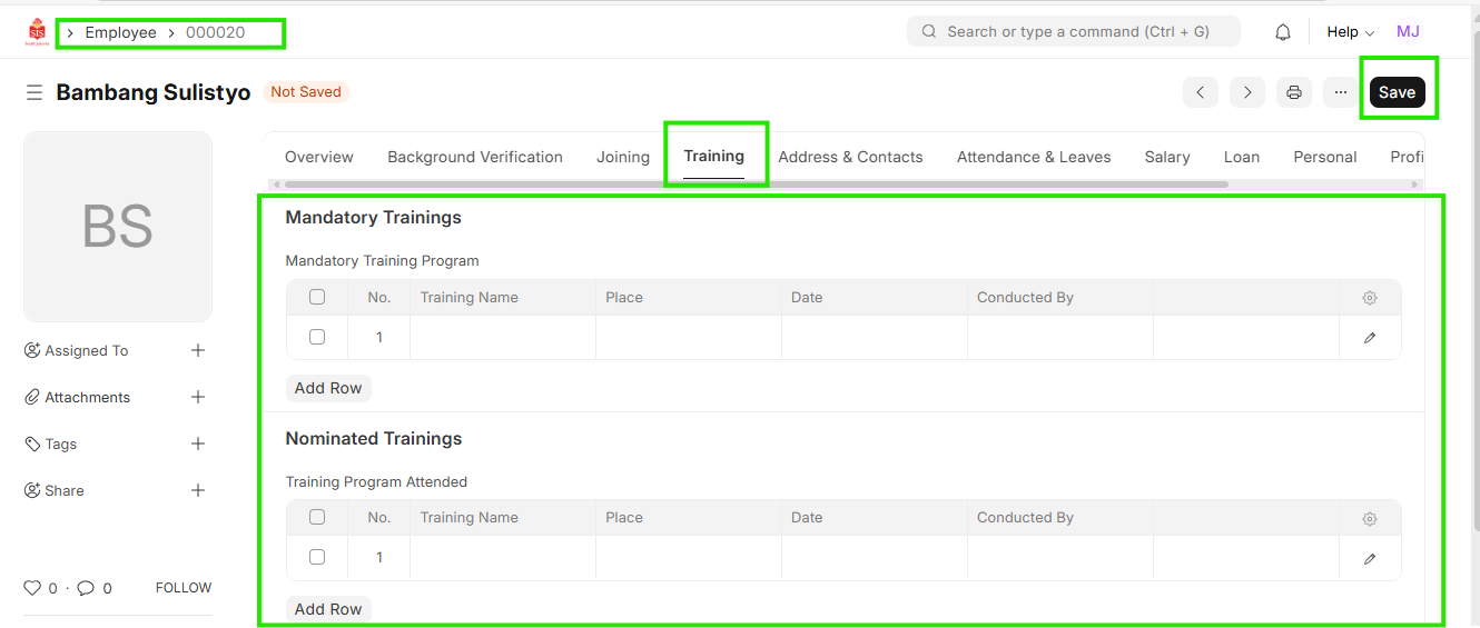 - Click on the Training Tab and update the details