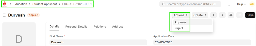 Home>Education>Student Applicant>click on Approve / Reject (button)